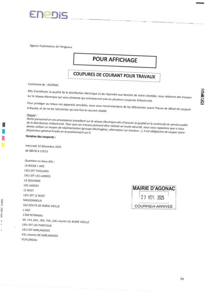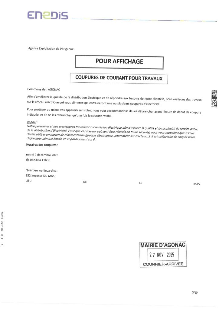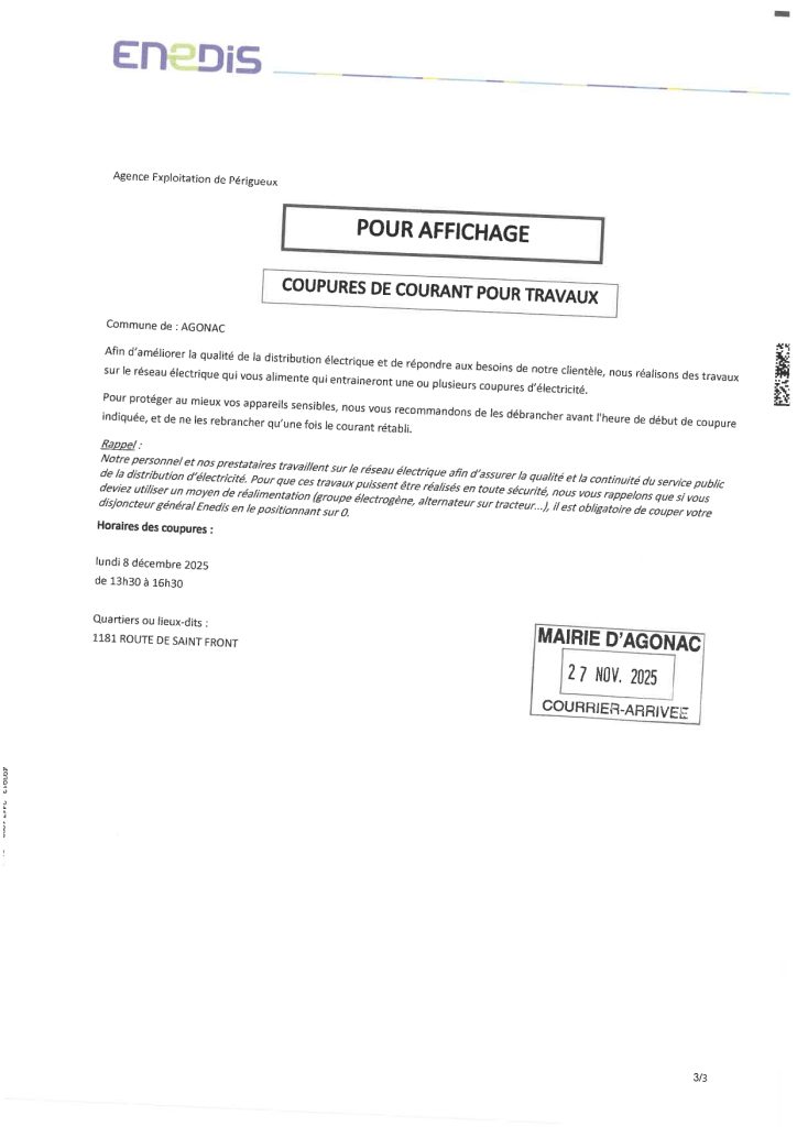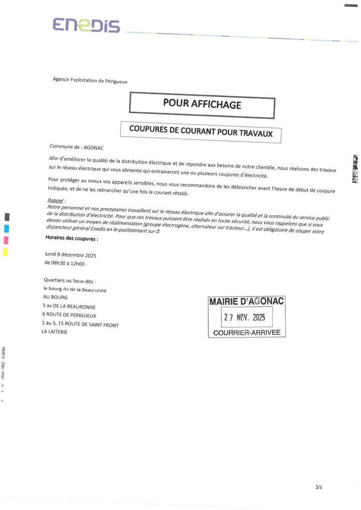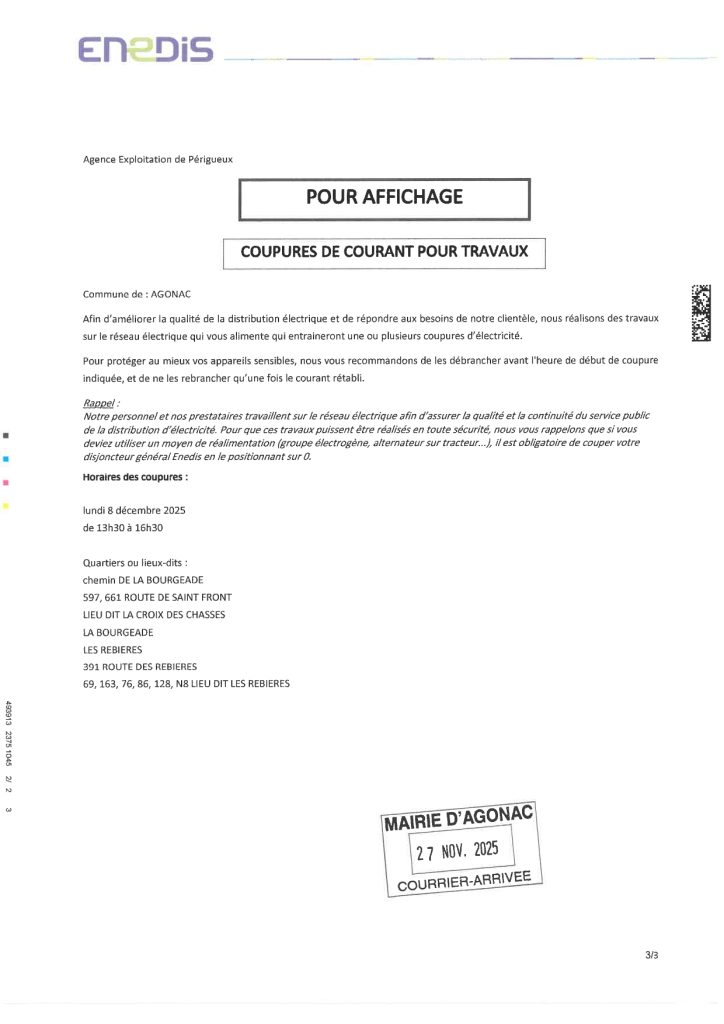 Coupures de courant pour travaux – Du 08 au 10 décembre 2025 par agadmin · Publié 28 novembre 2025 · Mis à jour 28 novembre 2025 Partager