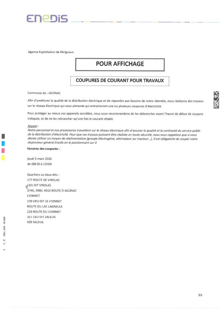 Coupures de courant pour travaux – Jeudi 05 mars – 8h30 à 12h par agadmin · Publié 24 février 2026 · Mis à jour 24 février 2026 Partager